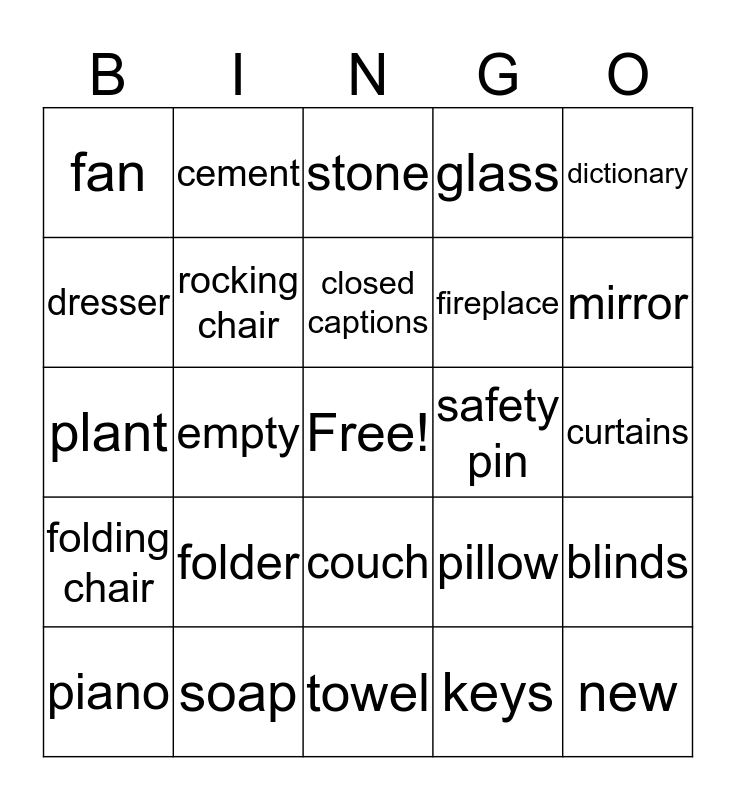 This bingo card has a free space and 67 words: bathtub, bed, blanket, blinds, brick, candle, cement, clock, closed captions, closet, couch, counter, curtains, dictionary, dishwasher, dresser, empty, fan, fence, fireplace, folder, folding chair, glass, keys, letter, magazine, match, microwave, mirror, nail clippers, new, newspaper, old, oven, phone, piano, picture, pillow, plant, pool, refrigerator, rocking chair, safety pin, scissors, screwdriver, sew, shelf, soap, stairs, stamp, stone, table, tape, tissue, toilet paper, towel, tv, umbrellas, all, few, found, gone, look for, lost, many, most and some.