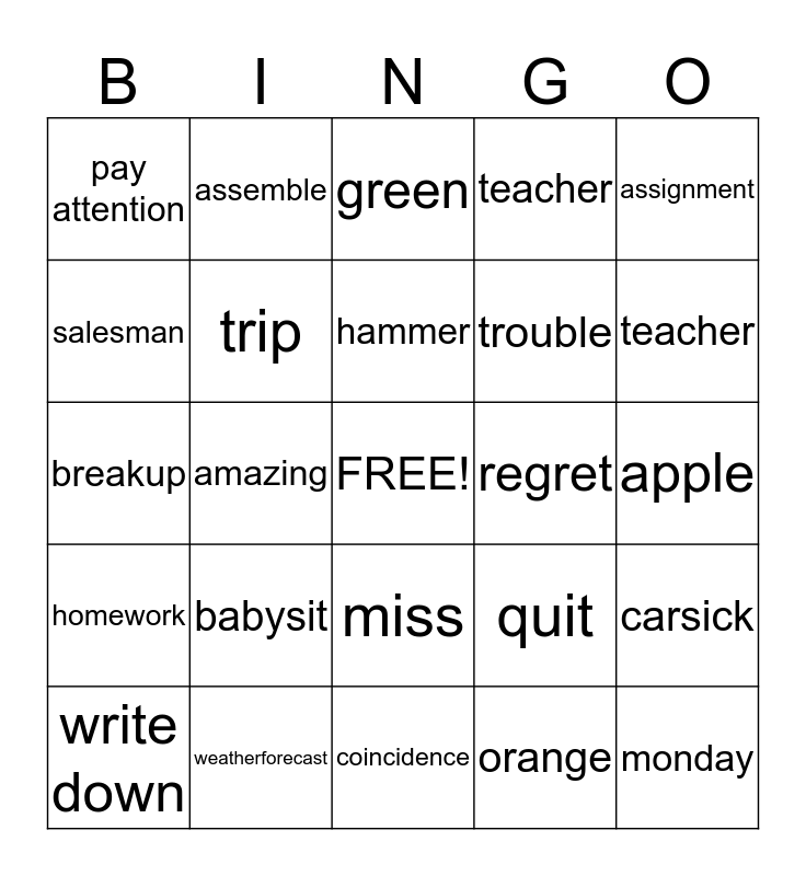 This bingo card has a free space and 24 words: babysit, weatherforecast, hammer, write down, assignment, pay attention, salesman, assemble, regret, miss, trouble, breakup, quit, carsick, trip, orange, apple, green, teacher, amazing, monday, homework, teacher and coincidence.