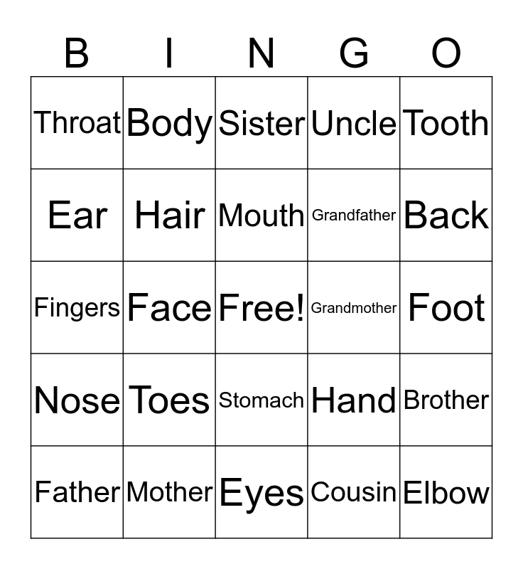 This bingo card has a free space and 24 words: Toes, Mother, Mouth, Father, Tooth, Throat, Ear, Body, Grandmother, Stomach, Grandfather, Fingers, Hand, Brother, Hair, Cousin, Foot, Sister, Back, Face, Elbow, Nose, Uncle and Eyes.