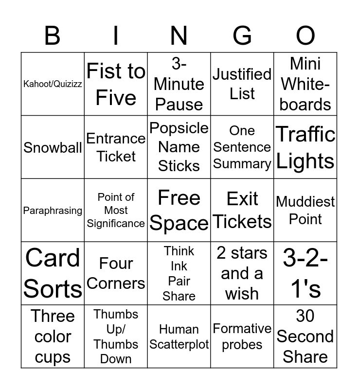 This bingo card has a free space and 24 words: Four Corners, Thumbs Up/ Thumbs Down, Popsicle Name Sticks, Three color cups, Mini White-boards, Kahoot/Quizizz, Snowball, Fist to Five, Exit Tickets, Think Ink Pair Share, One Sentence Summary, Paraphrasing, 2 stars and a wish, 3-2-1's, Entrance Ticket, Formative probes, Muddiest Point, 3-Minute Pause, Traffic Lights, Point of Most Significance, 30 Second Share, Card Sorts, Justified List and Human Scatterplot.