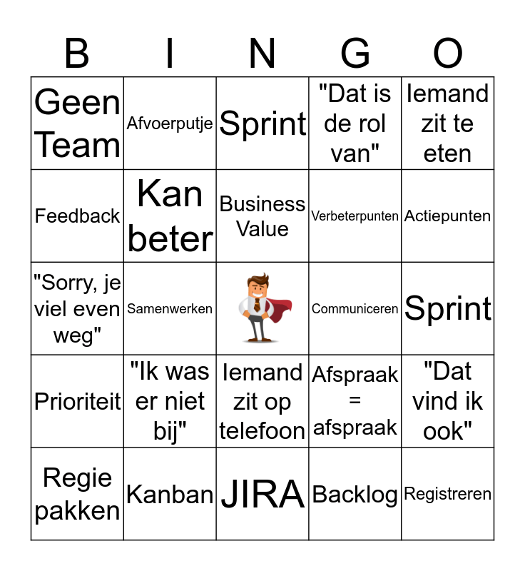 This bingo card has a free space and 31 words: JIRA, "Kuch, Kuch", Samenwerken, Kennisdelen, Geen Team, Sprint, Kan beter, Afspraak = afspraak, Communiceren, Backlog, Sprint, Registreren, Focus, Stand-Up, Actiepunten, SPOC, "Dat vind ik ook", "Ik was er niet bij", Prioriteit, Iemand zit op telefoon, Iemand zit te eten, "Ja maar ..", Regie pakken, Afvoerputje, Verbeterpunten, Feedback, "Dat is de rol van", "Sorry, je viel even weg", Kanban, Business Value and "Dat geldt niet voor mij".