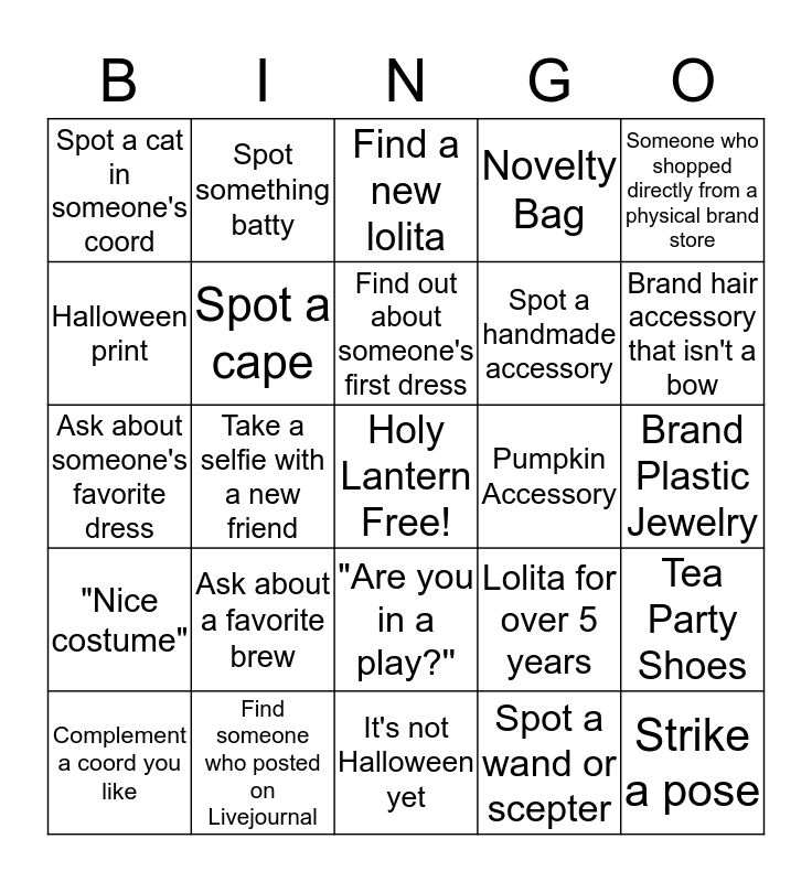 This bingo card has a free space and 26 words: "Are you in a play?'', Spot a wand or scepter, Find out about someone's first dress, Find someone who posted on Livejournal, Someone who shopped directly from a physical brand store, Spot a cat in someone's coord, Halloween print, Spot something batty, Brand Plastic Jewelry, Lolita for over 5 years, Spot a handmade accessory, Ask about someone's favorite dress, Tea Party Shoes, Complement a coord you like, Take a selfie with a new friend, Find a skull in someone's coord, Novelty Bag, "Nice costume", Find a new lolita, Strike a pose, Brand hair accessory that isn't a bow, It's not Halloween yet, Pumpkin Accessory, Ask about a favorite brew, Spot a cape and Plush Mascot.