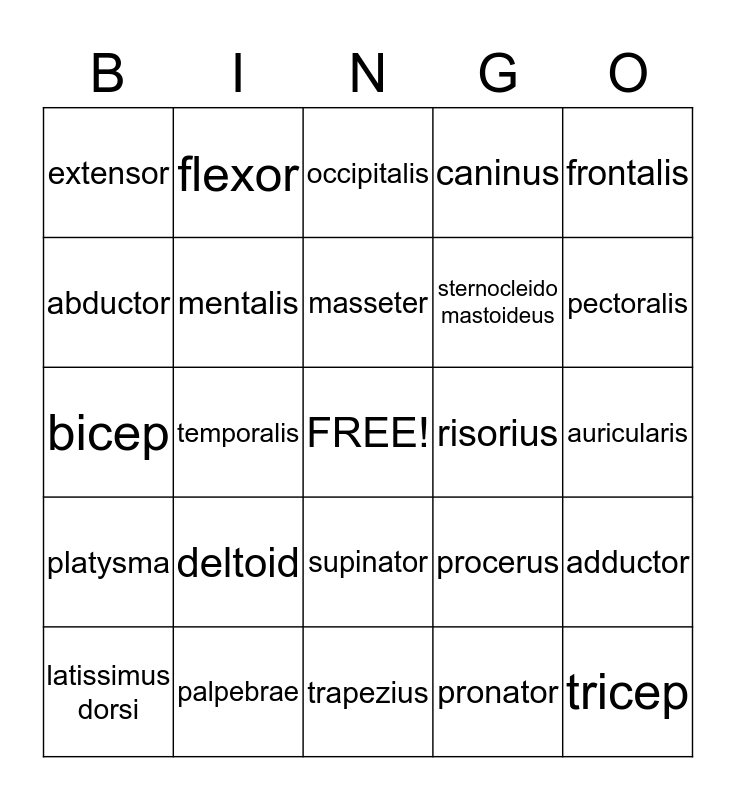 This bingo card has a free space and 24 words: deltoid, palpebrae, masseter, latissimus dorsi, frontalis, extensor, abductor, flexor, risorius, supinator, sternocleido mastoideus, bicep, procerus, adductor, mentalis, pronator, auricularis, occipitalis, pectoralis, temporalis, tricep, platysma, caninus and trapezius.