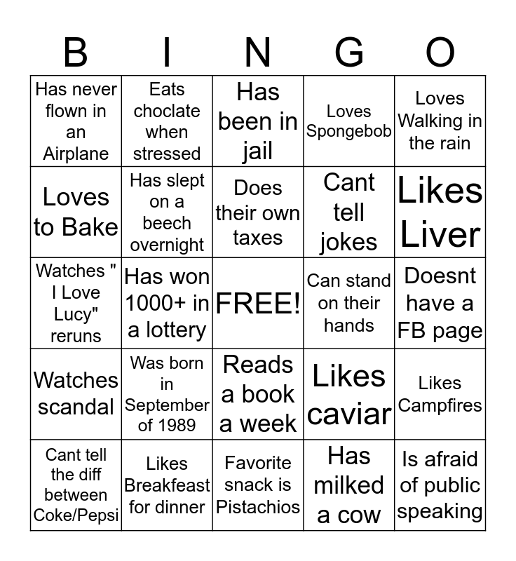 This bingo card has a free space and 24 words: Was born in September of 1989, Likes Breakfeast for dinner, Does their own taxes, Cant tell the diff between Coke/Pepsi, Loves Walking in the rain, Has never flown in an Airplane, Loves to Bake, Eats choclate when stressed, Can stand on their hands, Reads a book a week, Cant tell jokes, Watches " I Love Lucy" reruns, Likes caviar, Likes Campfires, Has slept on a beech overnight, Has milked a cow, Doesnt have a FB page, Has been in jail, Likes Liver, Has won 1000+ in a lottery, Is afraid of public speaking, Watches scandal, Loves Spongebob and Favorite snack is Pistachios.