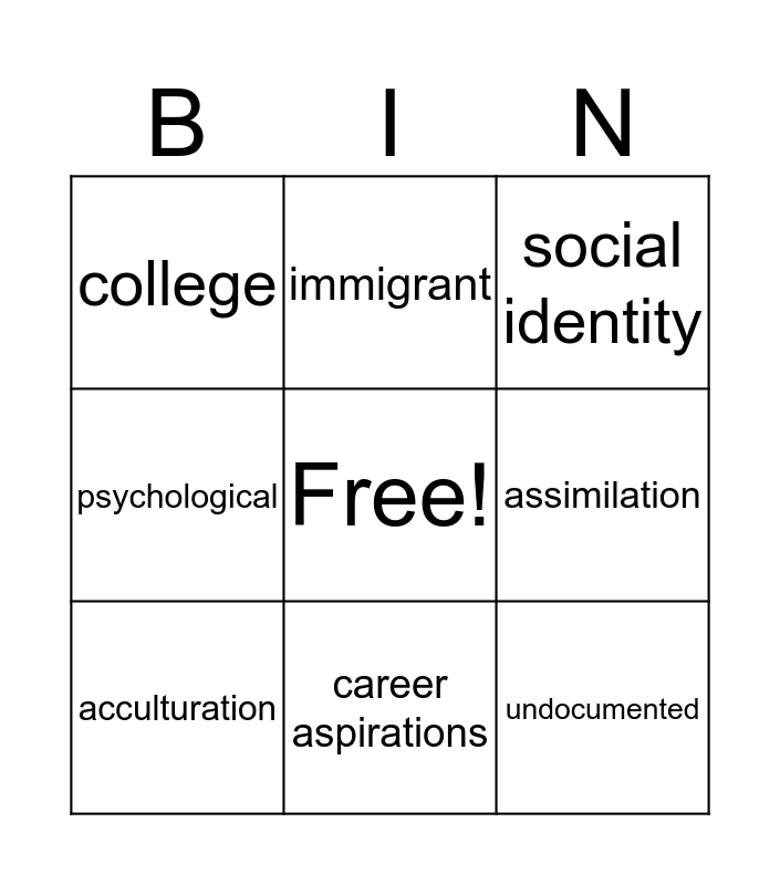This bingo card has a free space and 11 words: acculturation, persistence, assimilation, psychological, college, immigrant, undocumented, culture, career aspirations, social identity and maramba.