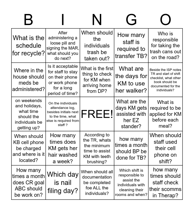 This bingo card has a free space and 24 words: How many times does KM gets her hair washed a week?, Which day is nail filing day?, What is the first thing to check for KM when arriving home from DP?, How many times a month does CR goal ABC should be work on?, Who is responsible for taking the trash cans out on the road?, What is the schedule for recycle?, Where in the house should meds be administered?, After administering a loose pill and signing the MAR, what should you do next?, What are the days KM gets assisted with her EZ stander?, According to the TR, whats the minimum time to assist KM with teeth brushing?, What are the days for KM to use her walker?, on weekends and holidays, what time should the individuals be getting up?, how many times a month should BP be done for TB?, When should staff used their cell phone on shift?, Is it acceptable for staff to stay on their phone or work phone for a long period of time?, Which shift is responsible to assist the individuals with cleaning their rooms and when?, What is required to be applied for KM before each meal?, When should the individuals trash be taken out?, Beside the ISP notes TR and start of shift checklist, what other book should be documented for the individuals?, On the individuals attendance log, besides initials next to the time, what else is required from staff ?, how many times should staff check their scomms in Therap?, When should KB cell phone be charged and where is it located?, How many staff is required to transfer TB? and When should all documentation be completed foe ALL the individuals?.