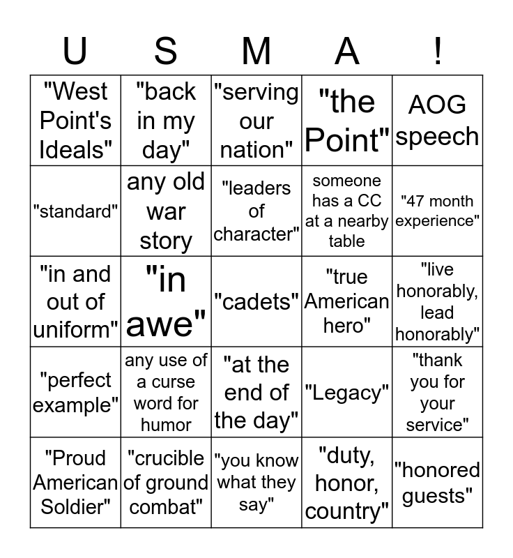 This bingo card has a free space and 39 words: "warm West Point welcome", any story about an NCO, "the definition of", any old war story, "Proud American Soldier", "at the end of the day", "leaders of character", "future leaders of America", AOG speech, "perfect example", "in awe", "the Point", "honored guests", "live honorably, lead honorably", "true American hero", any use of a curse word for humor, "long gray line", "West Point's Ideals", "class of (insert any year before 1945", "Legacy", "standard", "you know what they say", someone has a CC at a nearby table, "47 month experience", bad plebe uniform, "elite institution", "thank you for attending", "in the words of...", "equality", "back in my day", "Army brat", mentioning working hours, "serving our nation", "crucible of ground combat", "duty, honor, country", "prestigious award", "thank you for your service", "in and out of uniform" and "in peace and in war".