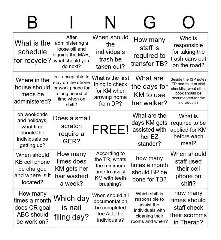 This bingo card has a free space and 24 words: How many times does KM gets her hair washed a week?, Which day is nail filing day?, What is the first thing to check for KM when arriving home from DP?, How many times a month does CR goal ABC should be work on?, Who is responsible for taking the trash cans out on the road?, What is the schedule for recycle?, Where in the house should meds be administered?, After administering a loose pill and signing the MAR, what should you do next?, What are the days KM gets assisted with her EZ stander?, According to the TR, whats the minimum time to assist KM with teeth brushing?, What are the days for KM to use her walker?, on weekends and holidays, what time should the individuals be getting up?, how many times a month should BP be done for TB?, When should staff used their cell phone on shift?, Is it acceptable to stay on the ohone or work phone for a long period of time when on shift?, Which shift is responsible to assist the individuals with cleaning their rooms and when?, What is required to be applied for KM before each meal?, When should the individuals trash be taken out?, Beside the ISP notes TR and start of shift checklist, what other book should be documented for the individuals?, Does a small scratch require a GER?, how many times should staff check their scomms in Therap?, When should KB cell phone be charged and where is it located?, How many staff is required to transfer TB? and When should all documentation be completed foe ALL the individuals?.
