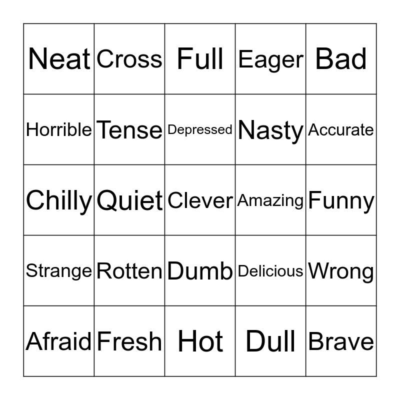 This bingo card has 29 words: Afraid, Sad, Quiet, Brave, Neat, Full, Tense, Rotten, Amazing, Fresh, Funny, Clever, Hot, Dull, Accurate, Quick, Dumb, Strange, Bad, Chilly, Delicious, Fine, Nasty, Horrible, Eager, Cross, Wrong, Depressed and Old.