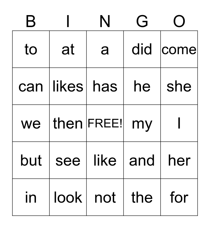 This bingo card has a free space and 24 words: see, look, has, in, come, to, can, at, my, like, he, we, and, her, likes, the, I, a, she, then, for, but, did and not.