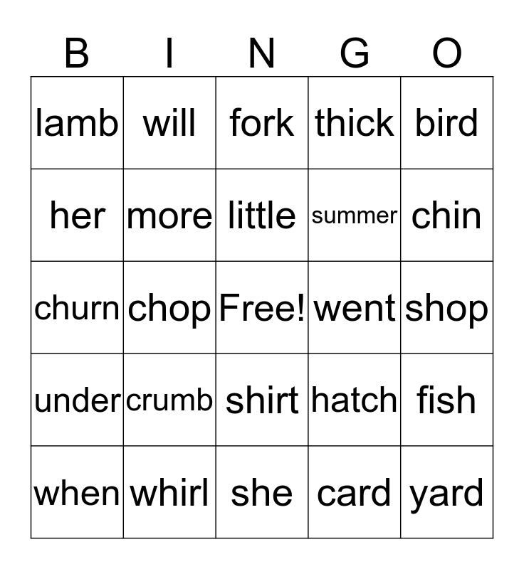 This bingo card has a free space and 24 words: crumb, whirl, little, when, bird, lamb, her, will, went, shirt, summer, churn, hatch, fish, more, card, shop, fork, chin, chop, yard, under, thick and she.
