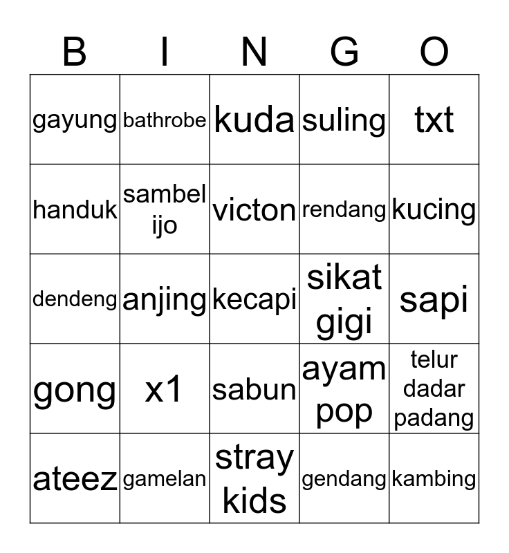 This bingo card has 25 words: x1, stray kids, victon, ateez, txt, gayung, handuk, bathrobe, sikat gigi, sabun, rendang, dendeng, ayam pop, telur dadar padang, sambel ijo, kambing, sapi, kuda, kucing, anjing, kecapi, gamelan, gong, suling and gendang.