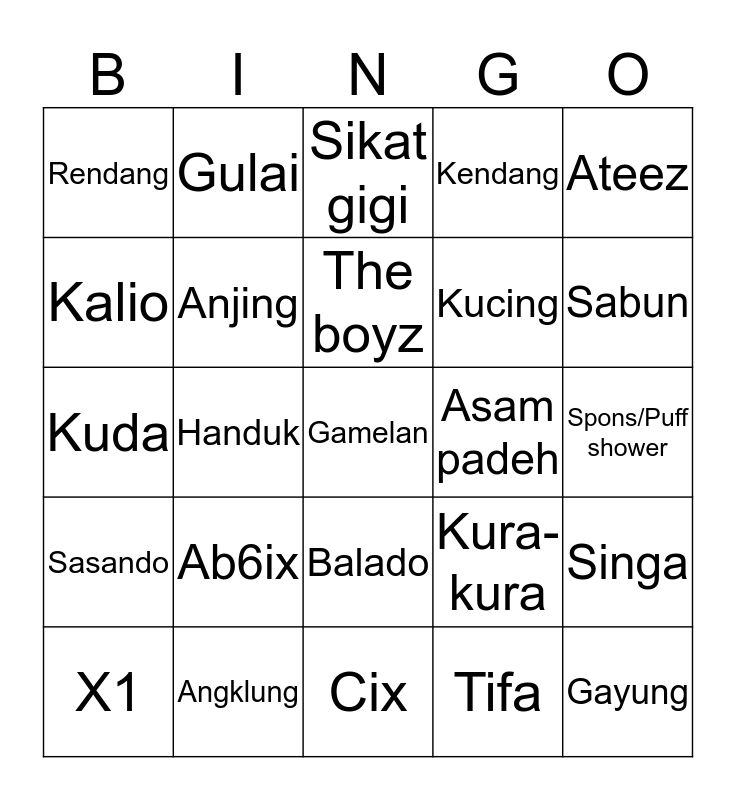 This bingo card has 25 words: Ab6ix, Cix, The boyz, X1, Ateez, Rendang, Kalio, Gulai, Asam padeh, Balado, Kucing, Kuda, Kura-kura, Singa, Anjing, Gayung, Spons/Puff shower, Sikat gigi, Sabun, Handuk, Gamelan, Angklung, Sasando, Kendang and Tifa.