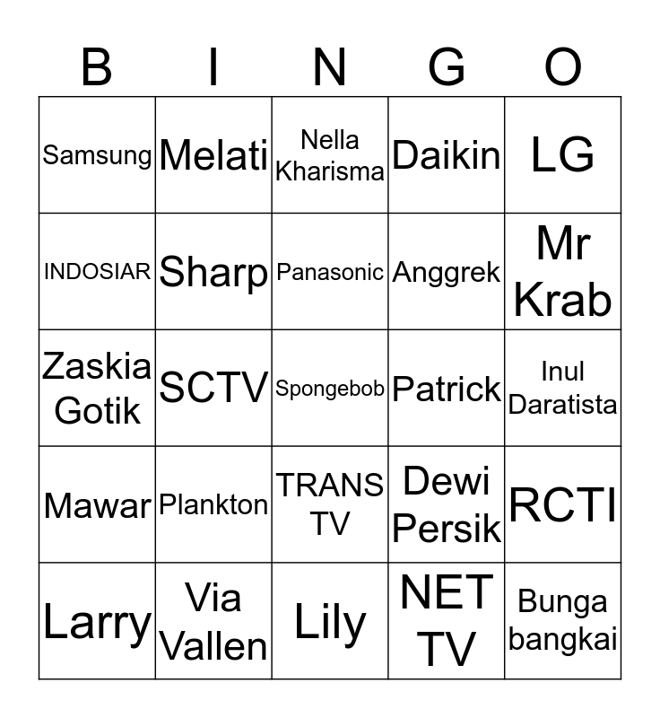 This bingo card has 25 words: Mawar, Via Vallen, Spongebob, NET TV, LG, Samsung, Melati, Nella Kharisma, Patrick, RCTI, INDOSIAR, Sharp, Lily, Dewi Persik, Mr Krab, Larry, SCTV, Panasonic, Anggrek, Inul Daratista, Zaskia Gotik, Plankton, TRANS TV, Daikin and Bunga bangkai.