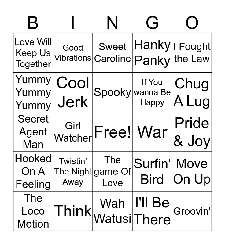 This bingo card has a free space and 75 words: Honky Tonk Women, Everyday People, Sweet Caroline, Down On The Corner, Bad Moon Rising, And When I Die, This Magic Moment, More Today Than Yesterday, I Heard It Through The Grapevine, People Got To Be Free, Dock of The bay, Chain Of Fools, Spooky, Yummy Yummy Yummy, Who's Making Love, Girl Watcher, Little bit O' Soul, Groovin', Somebody To Love, I Fought the Law, Working In The Coal Mine, Secret Agent Man, Cool Jerk, Good Vibrations, Hanky Panky, You Can't hurry Love, The Birds & The Bees, Papa's Got A Brand new Bag, All Day & All Of The Night, I Want Candy, Treat Her Right, GTO, Hey Little Cobra, Surfin' Bird, Chug A Lug, If You wanna Be Happy, The Devil In Disguise, Baby Workout, Pride & Joy, I'll Be There, Get Ready, Joy To The World, Knock 3 Times, Bad Bad Leroy Brown, Will It Go Round In Circles, Dancing machine, The Loco Motion, Love Will Keep Us Together, Play That Funky Music, The Stroll, Cotton Fields, The game Of Love, You Sexy Thing, Long Cool Woman In A Black Dress, Start me Up, The Hippy Hippy Shake, Poison Ivy, She's A Lady, The Tears Of A Clown, Nowhere To Run, Twistin' The Night Away, Let's Twist Again, Saturday Night At The Movies, Save The Last Dance For Me, Baby Love, War, It Takes Two, This Old Heart Of Mine, Take Me In Your Arms, Move On Up, Hooked On A Feeling, Think, Mustang Sally, Wah Watusi and Breaking Up Is Hard To Do.