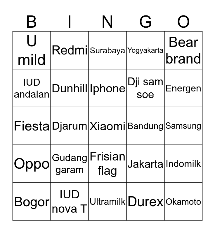 This bingo card has a free space and 24 words: Gudang garam, IUD nova T, Iphone, Bogor, Bear brand, U mild, IUD andalan, Redmi, Bandung, Frisian flag, Dji sam soe, Fiesta, Jakarta, Indomilk, Dunhill, Durex, Samsung, Surabaya, Energen, Djarum, Okamoto, Oppo, Yogyakarta and Ultramilk.