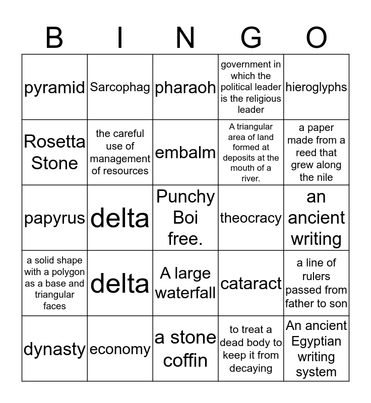 This bingo card has a free space and 24 words: delta, economy, embalm, dynasty, hieroglyphs, pyramid, Rosetta Stone, Sarcophag, theocracy, A large waterfall, A triangular area of land formed at deposits at the mouth of a river., papyrus, cataract, a line of rulers passed from father to son, the careful use of management of resources, to treat a dead body to keep it from decaying, an ancient writing, pharaoh, a paper made from a reed that grew along the nile, delta, An ancient Egyptian writing system, a solid shape with a polygon as a base and triangular faces, government in which the political leader is the religious leader and a stone coffin.