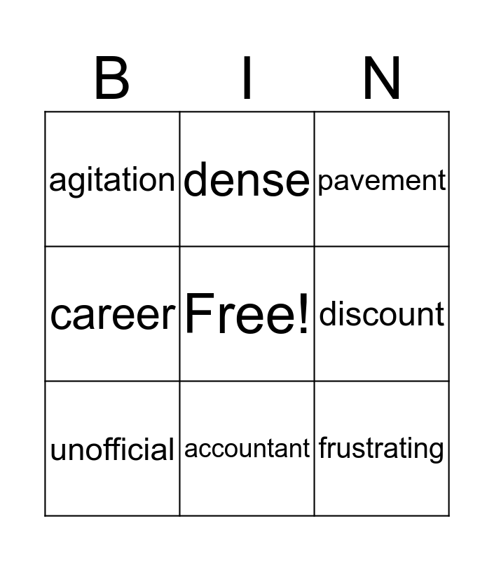 This bingo card has a free space and 11 words: Expedition, grunt, discount, unofficial, pavement, agitation, accountant, underage, career, dense and frustrating.