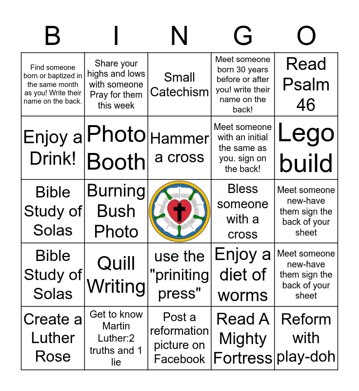 This bingo card has a free space and 24 words: Quill Writing, Get to know Martin Luther:2 truths and 1 lie, Hammer a cross, Create a Luther Rose, Read Psalm 46, Find someone born or baptized in the same month as you! Write their name on the back., Enjoy a Drink!, Share your highs and lows with someone Pray for them this week, Bless someone with a cross, use the "priniting press", Meet someone with an initial the same as you. sign on the back!, Bible Study of Solas, Enjoy a diet of worms, Meet someone new-have them sign the back of your sheet, Photo Booth, Read A Mighty Fortress, Meet someone new-have them sign the back of your sheet, Small Catechism, Lego build, Burning Bush Photo, Reform with play-doh, Bible Study of Solas, Meet someone born 30 years before or after you! write their name on the back! and Post a reformation picture on Facebook.