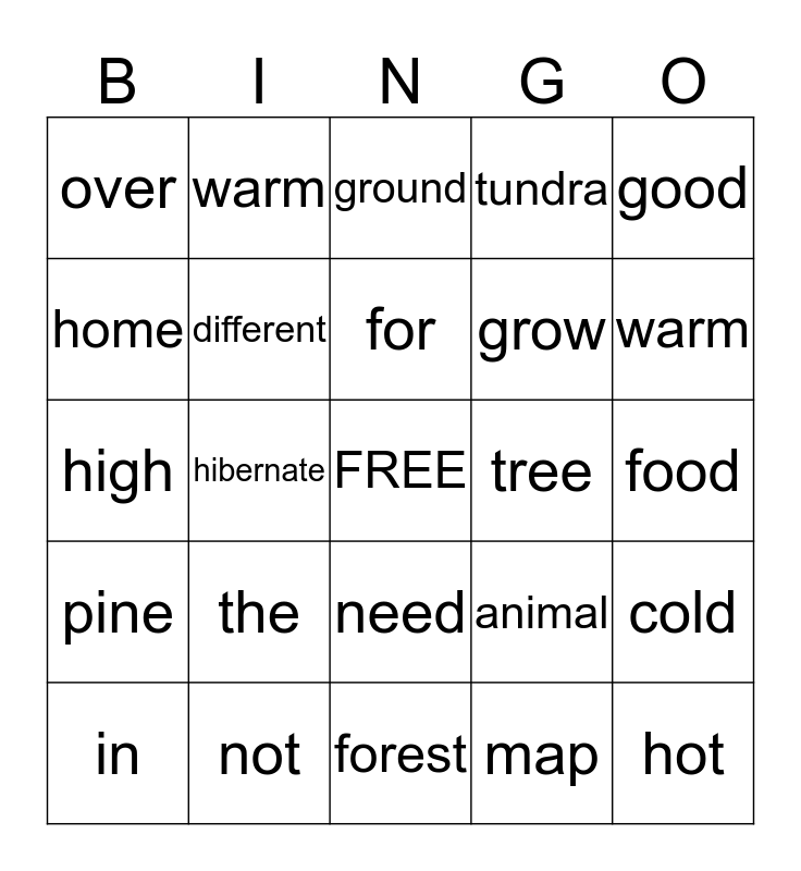 This bingo card has a free space and 24 words: the, not, for, in, good, over, home, warm, tree, need, grow, high, animal, cold, different, map, food, ground, warm, hibernate, hot, pine, tundra and forest.