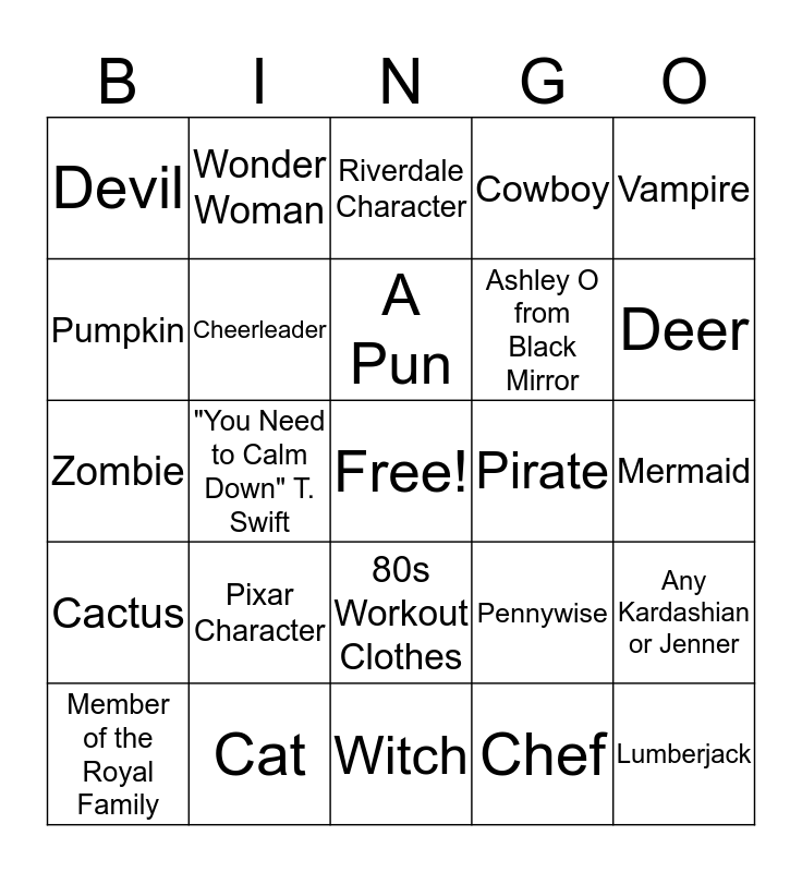 This bingo card has a free space and 30 words: Cat, Stranger Things Character, "You Need to Calm Down" T. Swift, An Avenger, Devil, Riverdale Character, Cheerleader, 80s Workout Clothes, Pirate, Witch, Mermaid, Lumberjack, Chef, Scientist, Deer, Mickey or Minnie Mouse, Pennywise, Cactus, Pixar Character, Vampire, Zombie, Lil Nas X, Wonder Woman, Ashley O from Black Mirror, Pumpkin, Cowboy, Any Kardashian or Jenner, Member of the Royal Family, A Pun and Detailed Full-face Makeup.