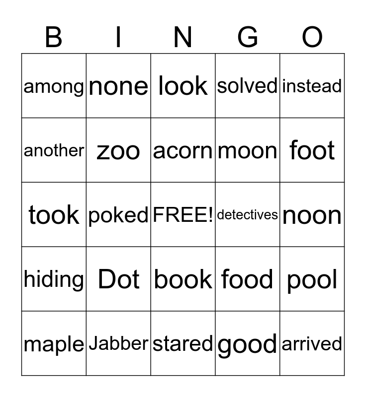 This bingo card has a free space and 24 words: Dot, Jabber, acorn, maple, instead, among, another, none, detectives, book, moon, took, food, pool, zoo, good, noon, look, foot, poked, arrived, hiding, solved and stared.
