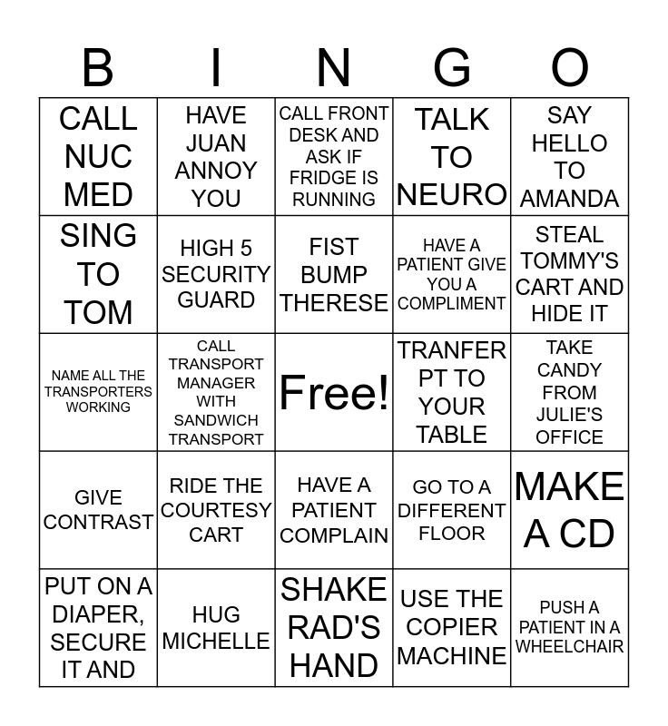 This bingo card has a free space and 24 words: RIDE THE COURTESY CART, HUG MICHELLE, FIST BUMP THERESE, PUT ON A DIAPER, SECURE IT AND, SAY HELLO TO AMANDA, CALL NUC MED, SING TO TOM, HAVE JUAN ANNOY YOU, TRANFER PT TO YOUR TABLE, HAVE A PATIENT COMPLAIN, HAVE A PATIENT GIVE YOU A COMPLIMENT, NAME ALL THE TRANSPORTERS WORKING, GO TO A DIFFERENT FLOOR, MAKE A CD, HIGH 5 SECURITY GUARD, USE THE COPIER MACHINE, TAKE CANDY FROM JULIE'S OFFICE, CALL FRONT DESK AND ASK IF FRIDGE IS RUNNING, STEAL TOMMY'S CART AND HIDE IT, CALL TRANSPORT MANAGER WITH SANDWICH TRANSPORT, PUSH A PATIENT IN A WHEELCHAIR, GIVE CONTRAST, TALK TO NEURO and SHAKE RAD'S HAND.