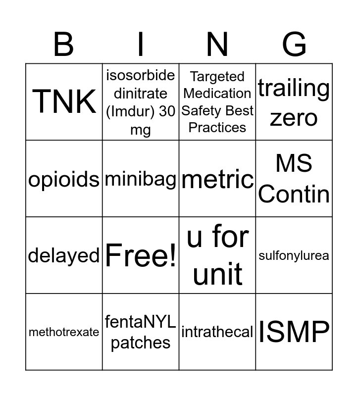 This bingo card has 18 words: Free!, ISMP, Targeted Medication Safety Best Practices, TNK, u for unit, trailing zero, methotrexate, isosorbide dinitrate (Imdur) 30 mg, MS Contin, delayed, intrathecal, opioids, sulfonylurea, minibag, metric, programmable infusion pump, fentaNYL patches and promethazine.