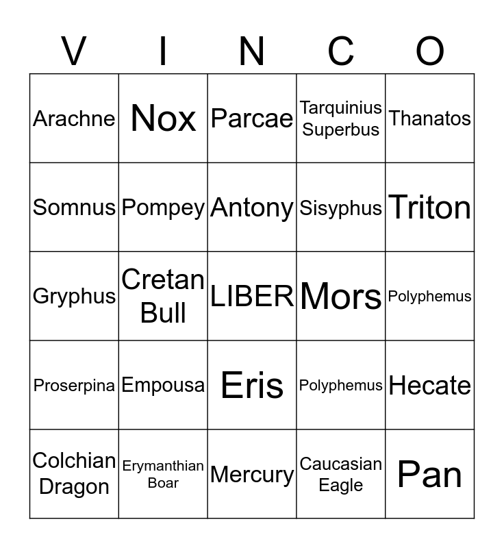 This bingo card has a free space and 27 words: Polyphemus, Hippogryph, Sisyphus, Mercury, Somnus, Parcae, Nox, Proserpina, Mors, Hecate, Gryphus, Tarquinius Superbus, Colchian Dragon, Erymanthian Boar, Triton, Hannibal, Pompey, Antony, Empousa, Arachne, Polyphemus, Caucasian Eagle, Cretan Bull, Pan, Eris, Thanatos and Typhon.