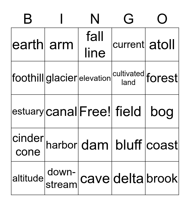 This bingo card has a free space and 29 words: altitude, bank, canal, dale, earth, fall line, glacier, harbor, field, down- stream, bog, brook, cave, delta, forest, chasm, dam, cinder cone, atoll, estuary, bluff, continent, cultivated land, foothill, current, arm, coast, elevation and ford.
