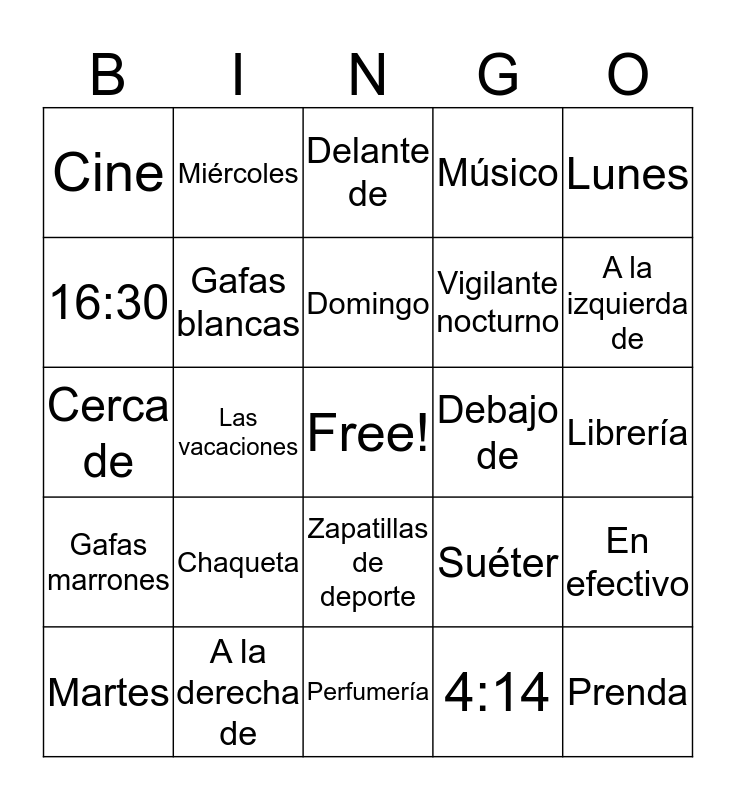 This bingo card has a free space and 34 words: 1:30, 4:14, Zapatos rojos, Pantalones verdes, Gafas marrones, Gafas blancas, Lunes, Martes, Miércoles, Viernes, Domingo, Delante de, Detrás de, Encima de, Debajo de, A la izquierda de, A la derecha de, Cerca de, Chaqueta, Suéter, Zapatillas de deporte, Gimnasio, Cine, Librería, Perfumería, Prenda, Músico, Veterinario, Vigilante nocturno, 16:30, 24:00, Las vacaciones, En efectivo and Horario.