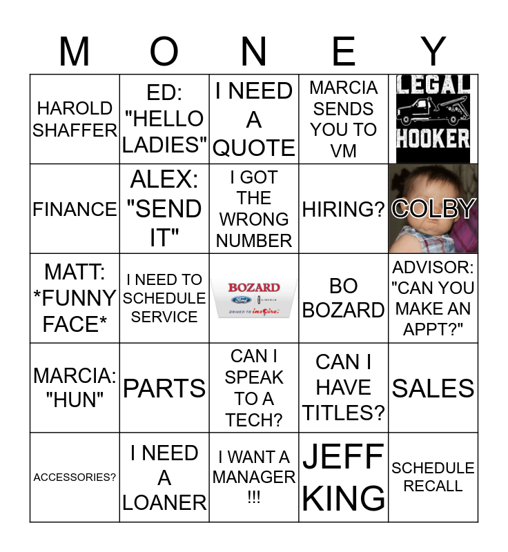 This bingo card has 2 images, a free space and 23 words: PARTS, I NEED A LOANER, I GOT THE WRONG NUMBER, ACCESSORIES?, HAROLD SHAFFER, FINANCE, ED: "HELLO LADIES", BO BOZARD, CAN I SPEAK TO A TECH?, HIRING?, MATT: *FUNNY FACE*, CAN I HAVE TITLES?, SALES, ALEX: "SEND IT", JEFF KING, ADVISOR: "CAN YOU MAKE AN APPT?", I NEED A QUOTE, COLBY, I NEED TO SCHEDULE SERVICE, SCHEDULE RECALL, MARCIA: "HUN", MARCIA SENDS YOU TO VM and I WANT A MANAGER !!!.