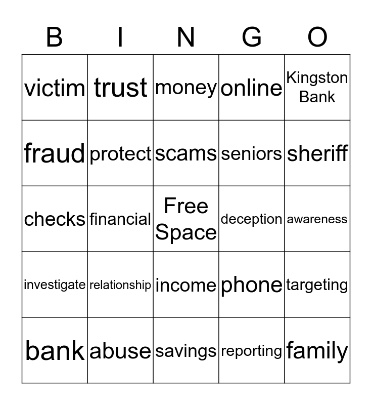 This bingo card has a free space and 24 words: relationship, abuse, scams, bank, Kingston Bank, victim, fraud, trust, deception, income, seniors, checks, phone, targeting, protect, reporting, awareness, money, sheriff, financial, family, investigate, online and savings.