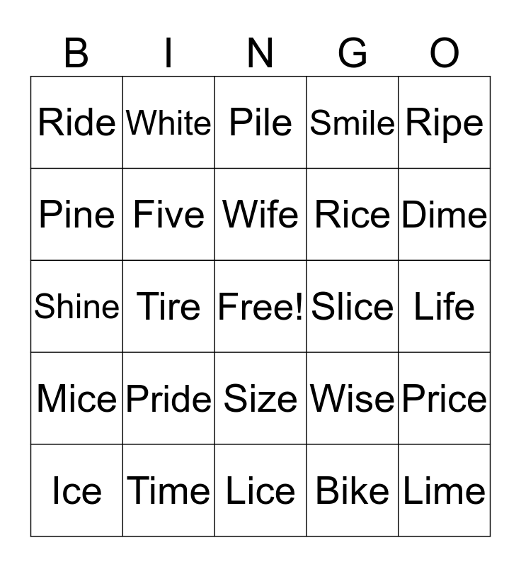 This bingo card has a free space and 58 words: Give, Time, Nice, Mice, Bike, Bite, Five, Wipe, Rice, Side, Smile, Like, Site, Fine, Dine, Ride, Lime, Ripe, Nine, Wife, Slice, Pile, Ice, Price, Wide, Life, Fire, Dice, Dime, File, Kite, Item, Hive, Hire, Hike, Hide, Line, Tire, Shine, Prize, Pride, Rise, Wise, Tile, Dive, Vine, Wire, Size, Lice, Crime, Drive, Glide, Knife, Spike, White, Smile, Pine and Bride.
