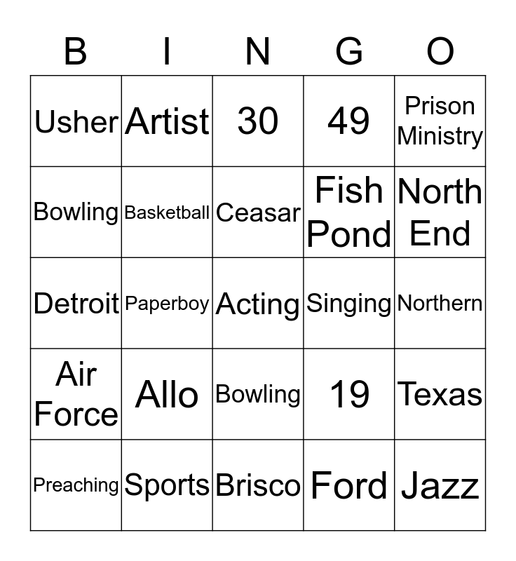 This bingo card has 25 words: Allo, Brisco, Ceasar, Preaching, Prison Ministry, Usher, Bowling, Artist, Singing, Bowling, Fish Pond, Detroit, 19, Texas, Basketball, Jazz, Northern, 30, North End, Paperboy, Acting, Sports, Air Force, 49 and Ford.