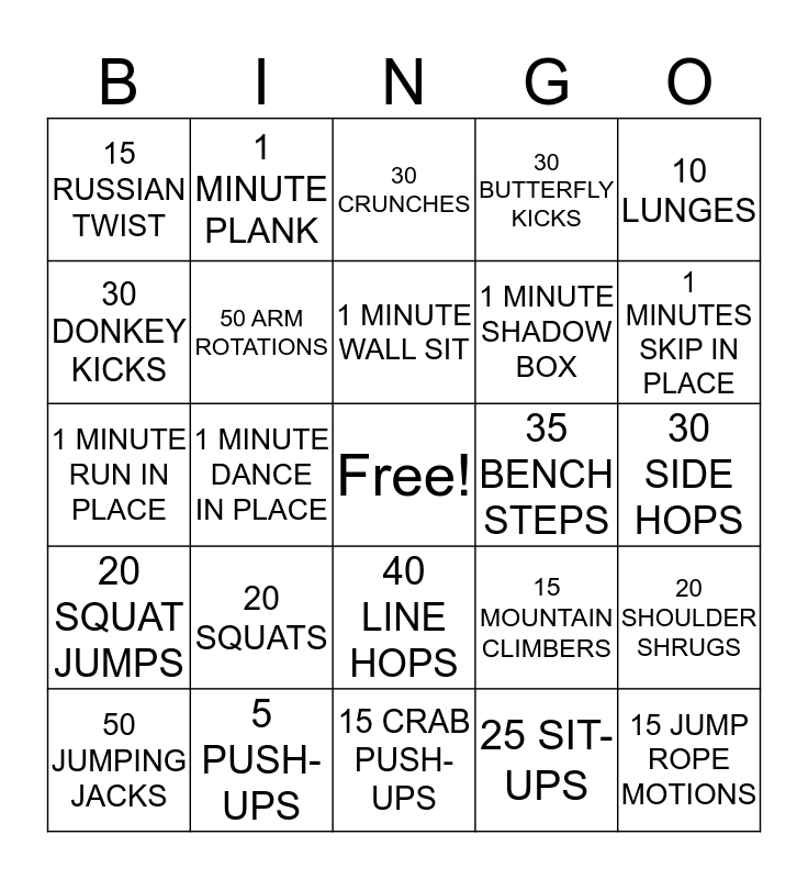 This bingo card has a free space and 24 words: 20 SQUATS, 5 PUSH-UPS, 1 MINUTE WALL SIT, 50 JUMPING JACKS, 10 LUNGES, 15 RUSSIAN TWIST, 30 DONKEY KICKS, 1 MINUTE PLANK, 35 BENCH STEPS, 40 LINE HOPS, 1 MINUTE SHADOW BOX, 1 MINUTE RUN IN PLACE, 15 MOUNTAIN CLIMBERS, 20 SHOULDER SHRUGS, 50 ARM ROTATIONS, 25 SIT-UPS, 30 SIDE HOPS, 30 CRUNCHES, 1 MINUTES SKIP IN PLACE, 1 MINUTE DANCE IN PLACE, 15 JUMP ROPE MOTIONS, 20 SQUAT JUMPS, 30 BUTTERFLY KICKS and 15 CRAB PUSH-UPS.