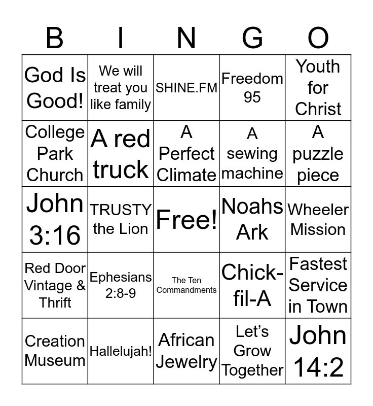 This bingo card has a free space and 29 words: Creation Museum, Table Talk, TRUSTY the Lion, The Ten Commandments, God Is Good!, SHINE.FM, A red truck, Ephesians 2:8-9, Noahs Ark, Hallelujah!, Wheeler Mission, John 14:2, African Jewelry, Let’s Grow Together, A puzzle piece, Backyard Blessings, The Ten Commandments, Red Door Vintage & Thrift, Youth for Christ, John 3:16, Chick-fil-A, Follow Jesus, A sewing machine, College Park Church, Freedom 95, We will treat you like family, Fastest Service in Town, A Perfect Climate and Sunshine Windows and Doors.