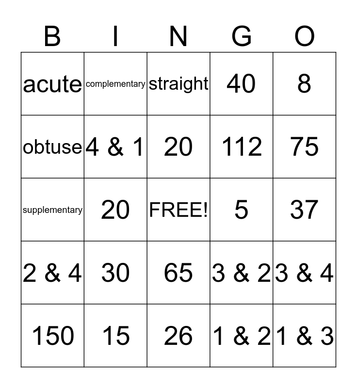 This bingo card has a free space and 24 words: 30, 15, 20, 150, 8, acute, obtuse, complementary, 5, 65, 112, supplementary, 3 & 2, 3 & 4, 4 & 1, 1 & 2, 37, straight, 75, 20, 1 & 3, 2 & 4, 40 and 26.