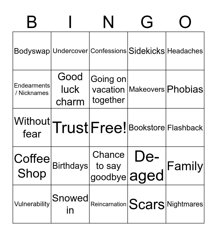 This bingo card has a free space and 24 words: Birthdays, Snowed in, Going on vacation together, Vulnerability, Headaches, Bodyswap, Endearments / Nicknames, Undercover, Bookstore, Chance to say goodbye, Makeovers, Without fear, De-aged, Family, Good luck charm, Scars, Flashback, Confessions, Phobias, Trust, Nightmares, Coffee Shop, Sidekicks and Reincarnation.