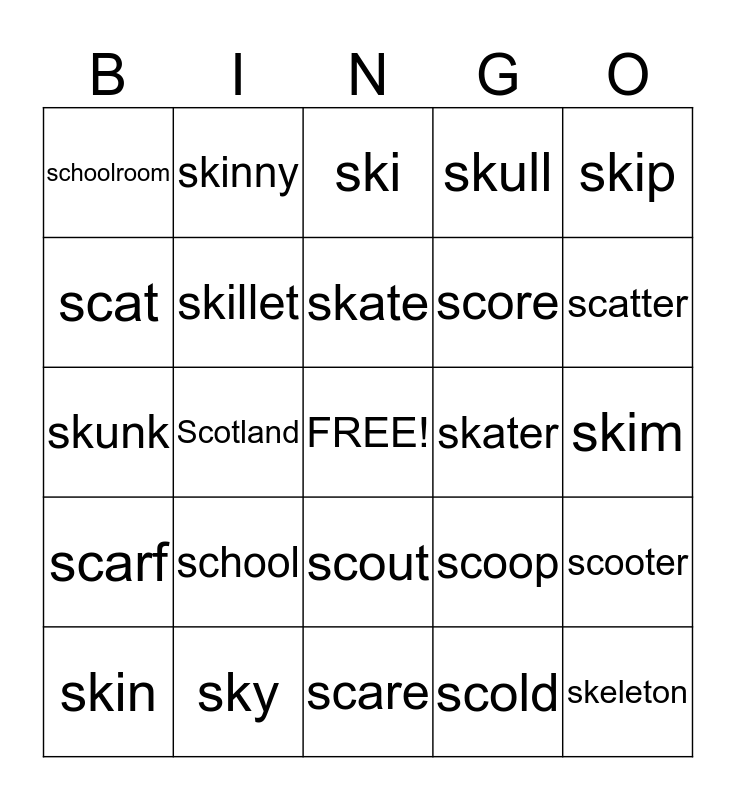 This bingo card has a free space and 24 words: school, sky, skate, skin, skip, schoolroom, scat, skinny, skater, scout, score, skunk, scoop, scooter, skillet, scold, skim, ski, scatter, Scotland, skeleton, scarf, skull and scare.