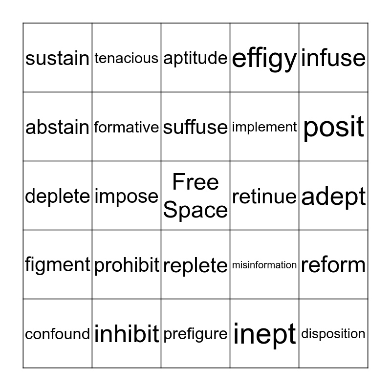 This bingo card has a free space and 24 words: prohibit, inhibit, suffuse, confound, infuse, sustain, abstain, tenacious, retinue, replete, implement, deplete, misinformation, reform, formative, inept, adept, aptitude, posit, impose, disposition, figment, effigy and prefigure.