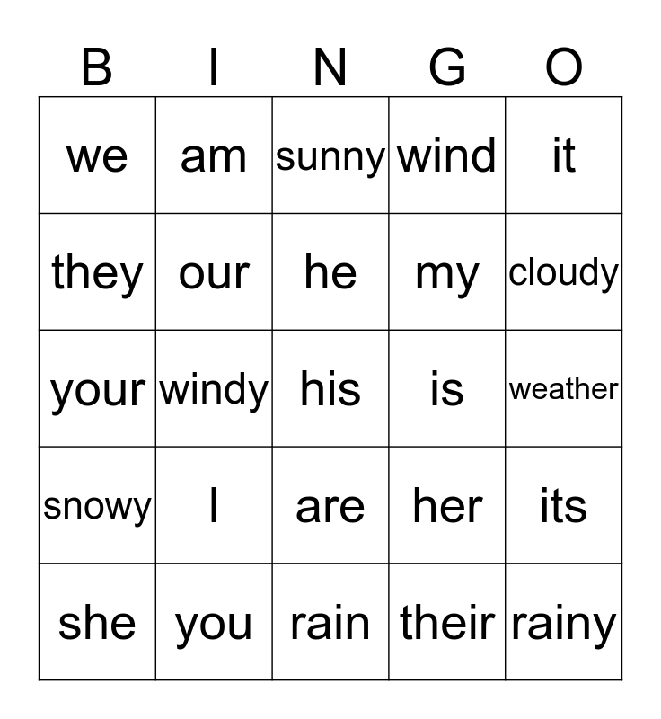This bingo card has a free space and 24 words: I, you, he, she, it, we, they, am, is, are, my, your, her, its, our, their, weather, sunny, cloudy, windy, rainy, snowy, wind and rain.