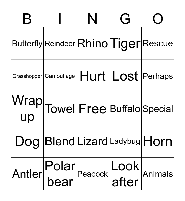 This bingo card has a free space and 24 words: Blend, Polar bear, Hurt, Antler, Rescue, Butterfly, Grasshopper, Reindeer, Buffalo, Lizard, Lost, Wrap up, Ladybug, Horn, Camouflage, Look after, Special, Rhino, Perhaps, Towel, Animals, Dog, Tiger and Peacock.