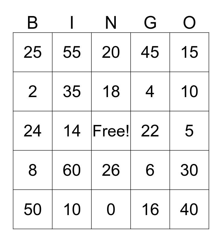 This bingo card has a free space and 24 words: 60, 10, 18, 50, 15, 25, 2, 55, 22, 26, 4, 24, 6, 30, 35, 16, 5, 20, 10, 14, 40, 8, 45 and 0.