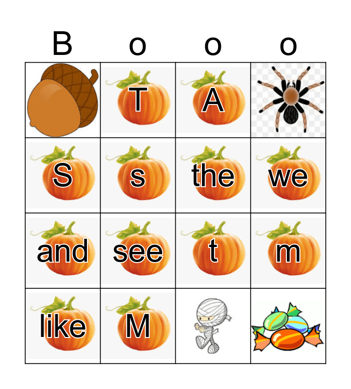This bingo card has 16 images and 12 words: M, m, A, and, T, t, S, s, like, see, we and the.