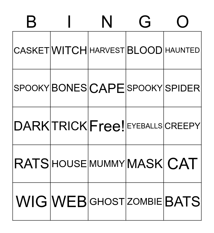 This bingo card has a free space and 24 words: WIG, HOUSE, CAPE, ZOMBIE, HAUNTED, CASKET, WITCH, HARVEST, EYEBALLS, CREEPY, DARK, BONES, MASK, CAT, SPOOKY, WEB, GHOST, BLOOD, SPIDER, RATS, TRICK, MUMMY, SPOOKY and BATS.