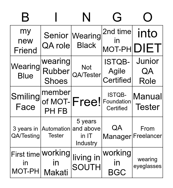 This bingo card has a free space and 24 words: Automation Tester, working in Makati, Not QA/Tester, First time in MOT-PH, into DIET, my new Friend, Wearing Blue, Senior QA role, ISTQB-Foundation Certified, 5 years and above in IT Industry, ISTQB- Agile Certified, Smiling Face, QA Manager, From Freelancer, wearing Rubber Shoes, working in BGC, Manual Tester, Wearing Black, Junior QA Role, member of MOT-PH FB, wearing eyeglasses, 3 years in QA/Testing, 2nd time in MOT-PH and living in SOUTH.