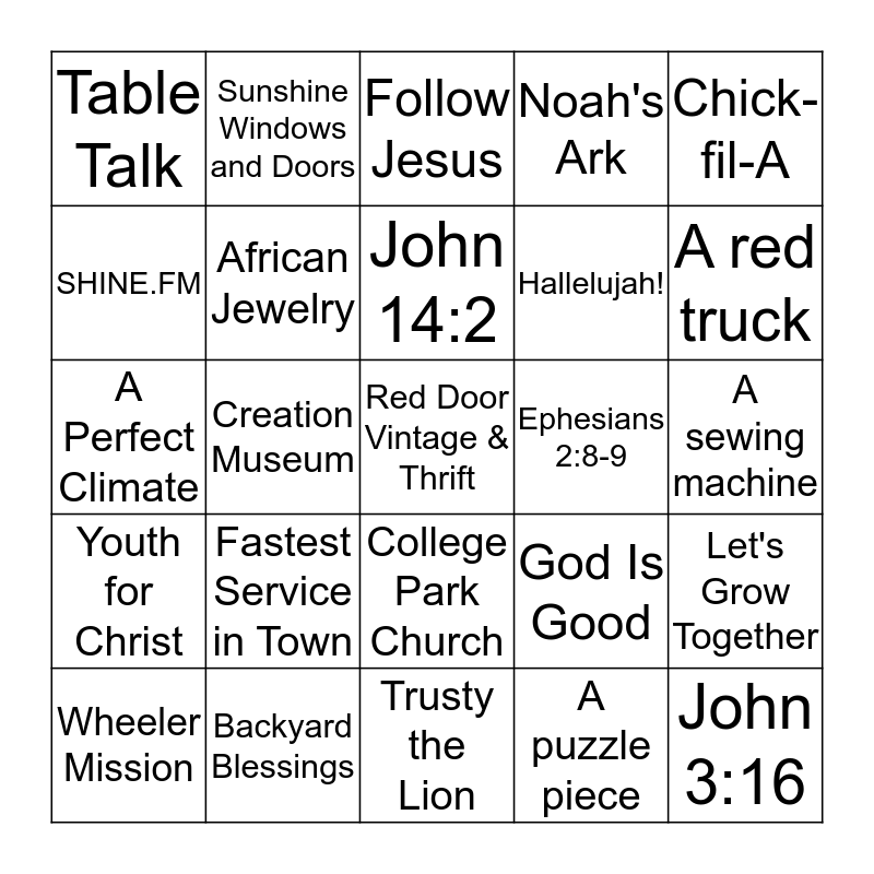 This bingo card has 25 words: Fastest Service in Town, Trusty the Lion, John 14:2, Wheeler Mission, Chick-fil-A, Table Talk, SHINE.FM, Sunshine Windows and Doors, Ephesians 2:8-9, College Park Church, Hallelujah!, A Perfect Climate, God Is Good, Let's Grow Together, African Jewelry, John 3:16, A sewing machine, Follow Jesus, A red truck, Creation Museum, Red Door Vintage & Thrift, Backyard Blessings, Youth for Christ, Noah's Ark and A puzzle piece.