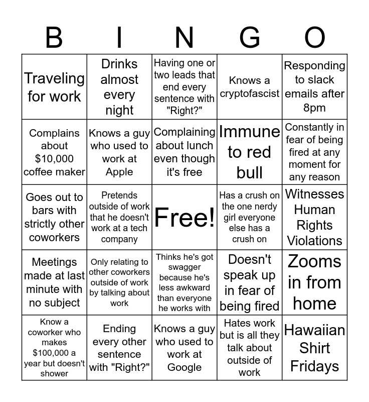 This bingo card has a free space and 24 words: Only relating to other coworkers outside of work by talking about work, Ending every other sentence with "Right?", Complaining about lunch even though it's free, Know a coworker who makes $100,000 a year but doesn't shower, Responding to slack emails after 8pm, Traveling for work, Complains about $10,000 coffee maker, Drinks almost every night, Has a crush on the one nerdy girl everyone else has a crush on, Thinks he's got swagger because he's less awkward than everyone he works with, Immune to red bull, Goes out to bars with strictly other coworkers, Doesn't speak up in fear of being fired, Zooms in from home, Knows a guy who used to work at Apple, Hates work but is all they talk about outside of work, Witnesses Human Rights Violations, Having one or two leads that end every sentence with "Right?", Constantly in fear of being fired at any moment for any reason, Pretends outside of work that he doesn't work at a tech company, Hawaiian Shirt Fridays, Meetings made at last minute with no subject, Knows a cryptofascist and Knows a guy who used to work at Google.