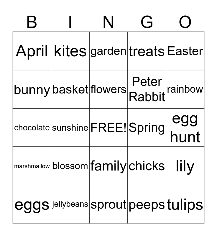 This bingo card has a free space and 24 words: blossom, jellybeans, flowers, eggs, Easter, April, bunny, kites, Spring, family, Peter Rabbit, chocolate, chicks, lily, basket, peeps, egg hunt, garden, rainbow, sunshine, tulips, marshmallow, treats and sprout.